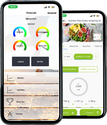Blitzschnell „misst“ unser System den Atem und sendet Ihnen direkt im Anschluss in der zugehörigen App die ausgewerteten Fitness- und Gesundheitsdaten. Dort können Sie nicht nur die einzelnen Werte Ihres Kunden bzw. Ihrer Kundin einzeln betrachten und verwenden, sie profitieren auch von unserer Expertise: Unsere App liefert Ihnen perfekt auf jede:n Einzelne:n abgestimmte Trainings- sowie Ernährungspläne. Dank der präzisen individuellen Parameter, auf denen unsere Pläne aufgebaut sind, verhelfen Sie mit VitaScale Ihren Kund:innen dabei, einfacher und insbesondere langfristig ihre Ziele zu erreichen.